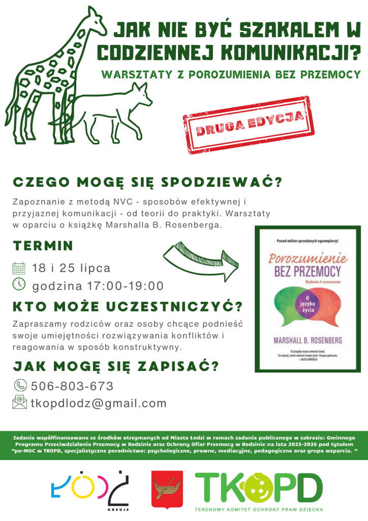 Po raz kolejny w tym roku mamy przyjemność organizować dla Was bezpłatne warsztaty, poruszające temat komunikacji bez przemocy. Marcowa edycja spotkała się z ogromnym zainteresowaniem. Mamy nadzieję, że i tym razem nie zabraknie chętnych!